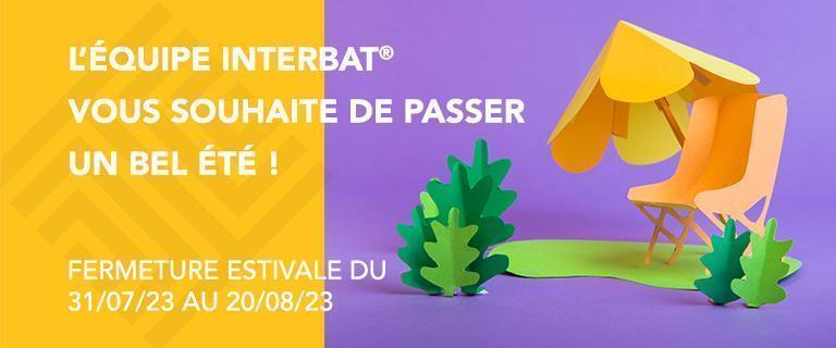 Chères clientes, chers clients, Nous vous informons que nous serons fermés du lundi 31 juillet au 20 août. Notre inventaire se déroulera semaines 34 et 35, où durant cette période une permanence téléphonique sera à votre écoute pour toute information complémentaire. Ainsi aucune expédition ne sera réalisée de la semaine 31 à 35.  Toutes les livraisons reprendront à partir du lundi 04/09/2023.   Vous n’avez pas reçu cette information par e-mail ? Inscrivez-vous à notre newsletter ! Vous trouverez le formulaire en bas de cette page.   Toute l’équipe Interbat® vous souhaite de passer un bon été.