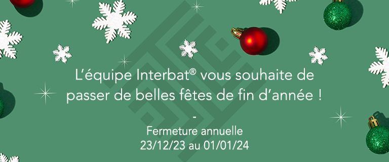 Chères clientes, Chers clients, Nous vous informons que nous serons fermés semaine 52 (du lundi 25 décembre au lundi 1er janvier 2024). Notre logistique pourra traiter vos commandes jusqu’au vendredi 22 décembre 2023. Ainsi, nous vous invitons à anticiper vos commandes dès à présent. Nous aurons le plaisir de vous retrouver le mardi 02 janvier dès 9h00. Toute l’équipe Interbat® vous souhaite de passer de belles fêtes de fin d’année.