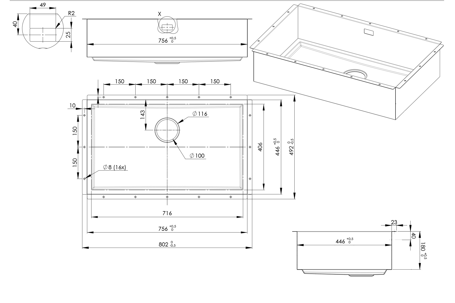 Cuve HESTIA 71, matière Inox Satiné, 1 cuve, livré avec vidage manuel et siphon, épaisseur de plan de travail 12 mm