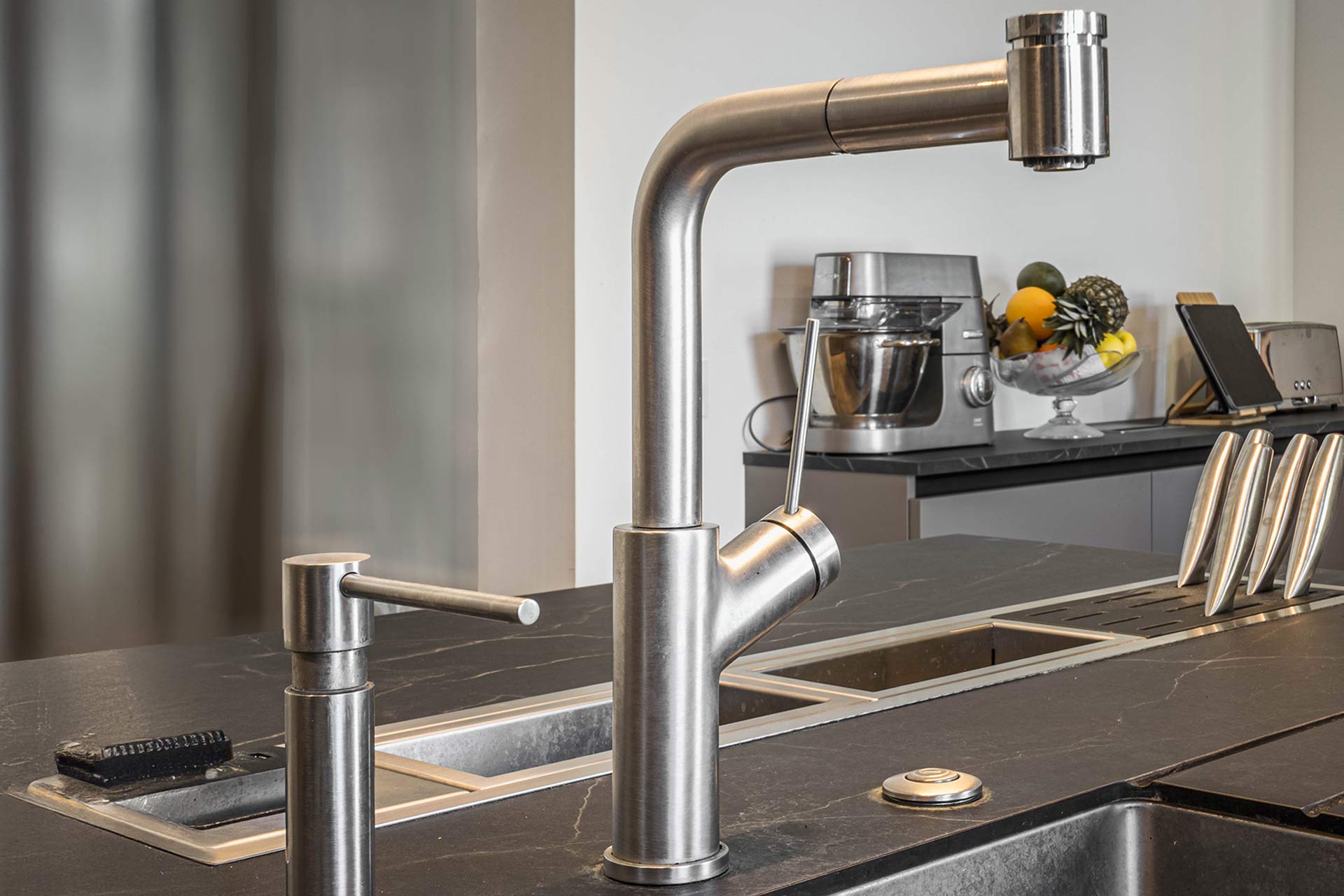Le mitigeur GOTADOU2J, est original et pratique. Son corps en « V » et sa manette ultra-fine, le différencie des autres mitigeurs. Grâce à sa douchette et la forme de son bec, sa prise en main est confortable. Retrouver ce mitigeur dans notre catalogue complet catalogue L’Univers de la cuisine.