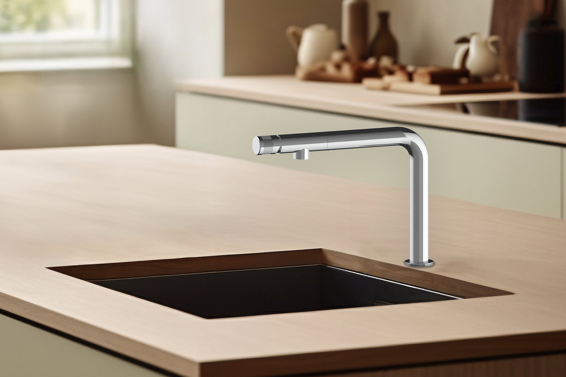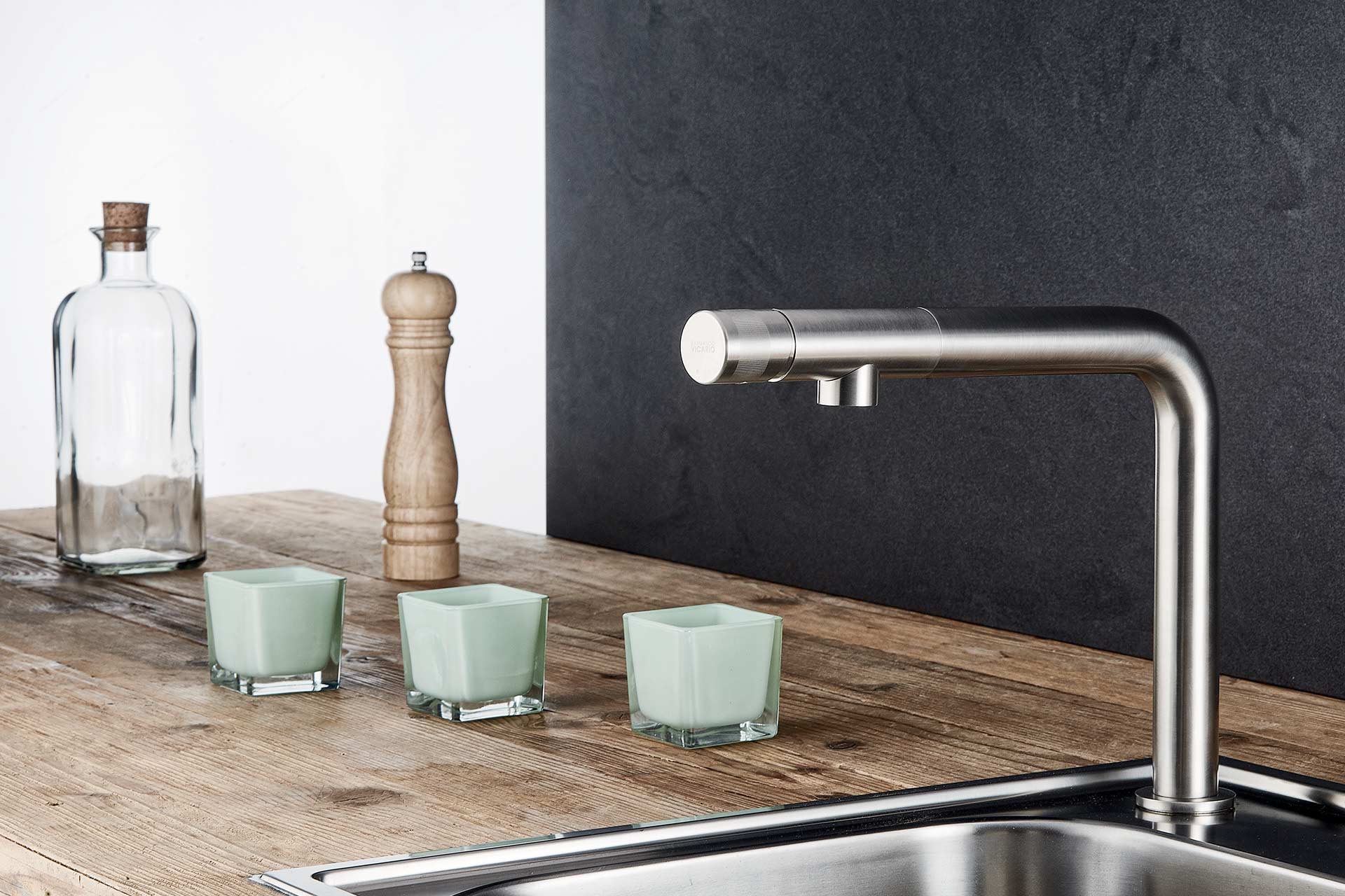 Le mitigeur LIRA est un robinet de cuisine design haut de gamme. Ce mitigeur est fabriqué en Italie et conçu en laiton pour garantir sa haute qualité. LIRA se démarque par son look ultra minimaliste, grâce à son corps en L et sa manette discrète au bout. Disponible en finition nickel brossé, noir et PVD ce mitigeur affirme le style de la cuisine. Véritable objet design, le LIRA n’a pas oublié d’être pratique. Sa hauteur de corps et sa rotation à 180° permettent une aisance d’utilisation (remplissage de casserole, nettoyage de la cuve…). Retrouvez sur notre catalogue catalogue L’Essentiel de la cuisine ce mitigeur dans un choix de pack évier-mitigeur.